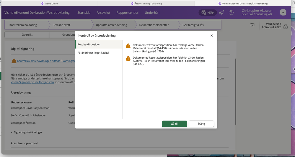 Har du bokfört resultatet för 2023 på 2099? På bilden du lagt med är saldot 0 på 2099 och det ska det ju inte vara för 2023. Eller lyckades du få precis noll i resultat det sista året?