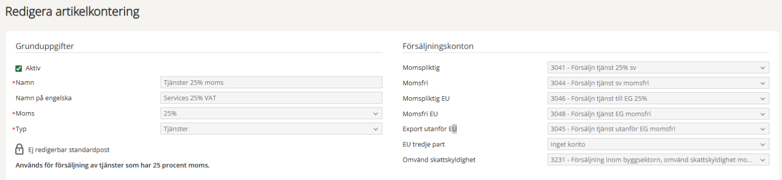 För att artikeln alltid ska styra mot momskod 40 behöver du säkerställa att kontot med momskod 40 är inlagt på artikelkonteringen under fliken Export utanför EU. Dessutom behöver kundens land vara registrerat som ett land utanför EU.