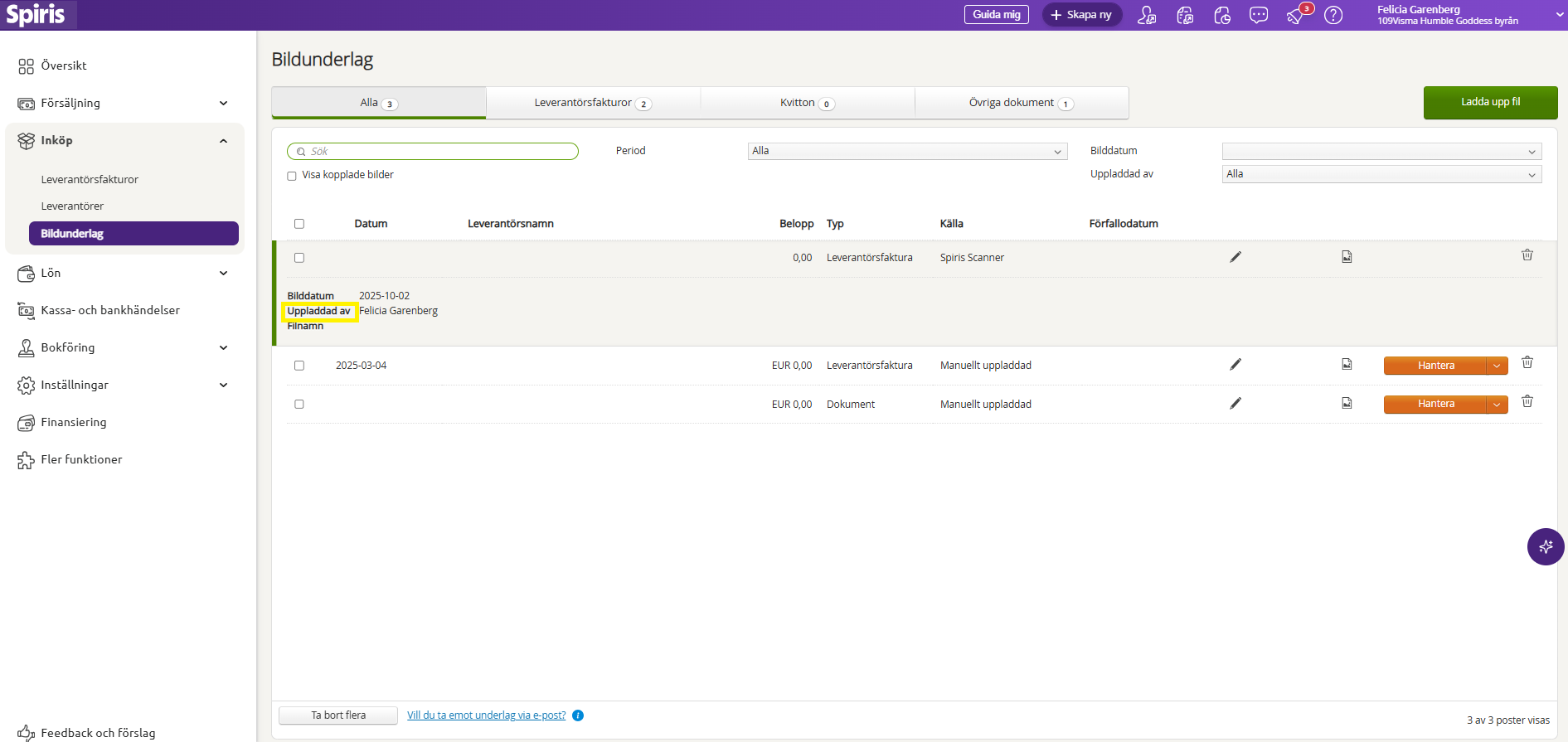 I detaljinformationen som öppnas ser du vem som laddat upp/skickat in underlaget samt tidpunkt.