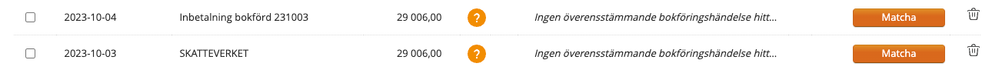 Jag har försökt matcha betalningen på företagskontot mot "Betalning till skatteverket" som jag gjort förut, men det fungerar inte nu när jag slagit på integration mot Skatteverket för skattekontot.