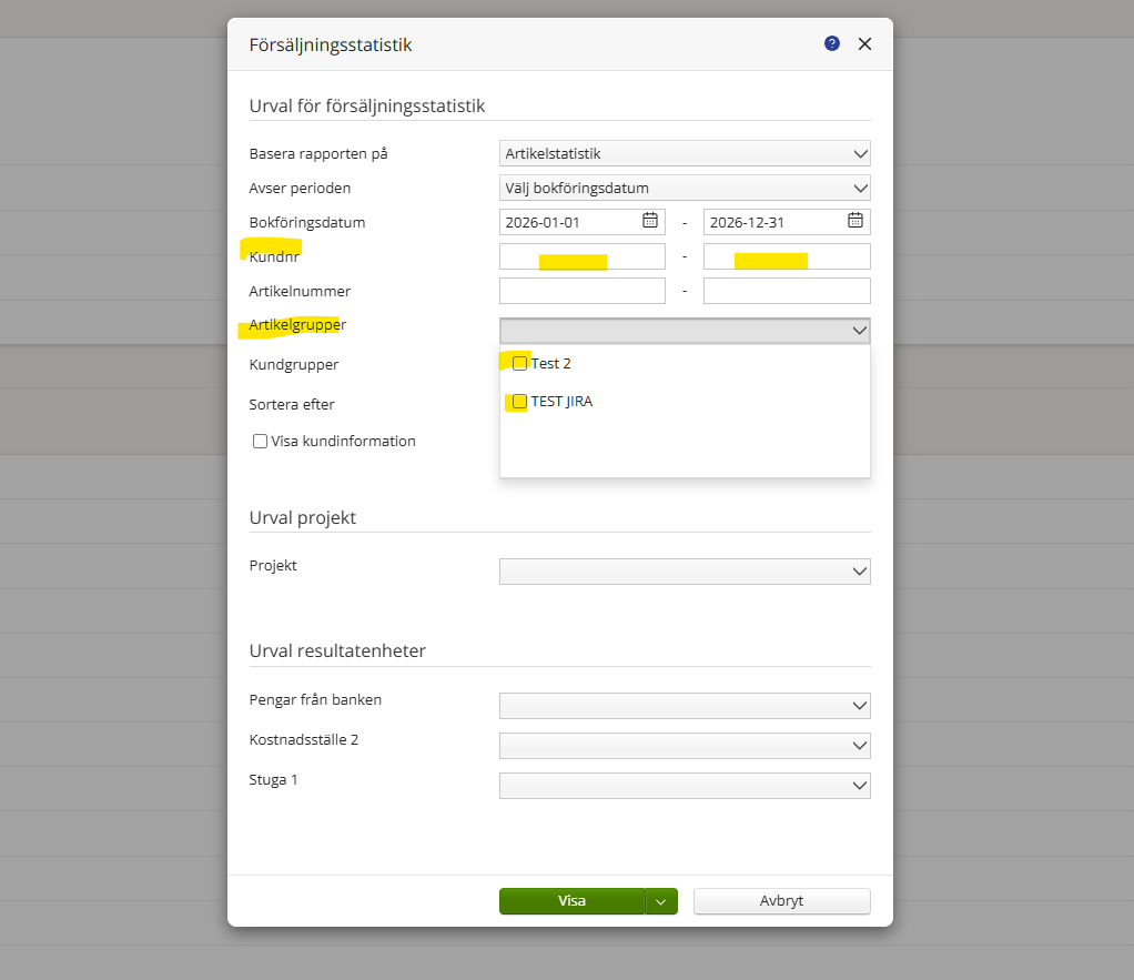 välja samtliga artikelgrupper, och filtrera på en specifik kund genom att ange kundnummer.
