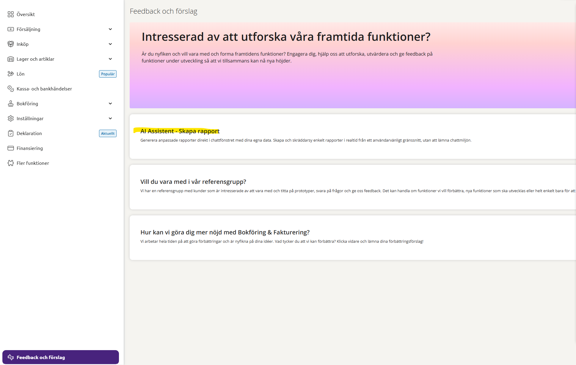 Om detta ändå inte ger exakt det upplägg du önskar, vill jag tipsa dig om att testa skapa rapporten via AI‑assistenten. AI‑assistenten kan skräddarsy rapporter baserat på den data som finns i ditt företag och kan ofta ta fram just den typ av sammanställning du beskriver – till exempel en rapport per kund med försäljning summerad per artikelgrupp. Det är ett smidigt sätt att få en mer anpassad rapport