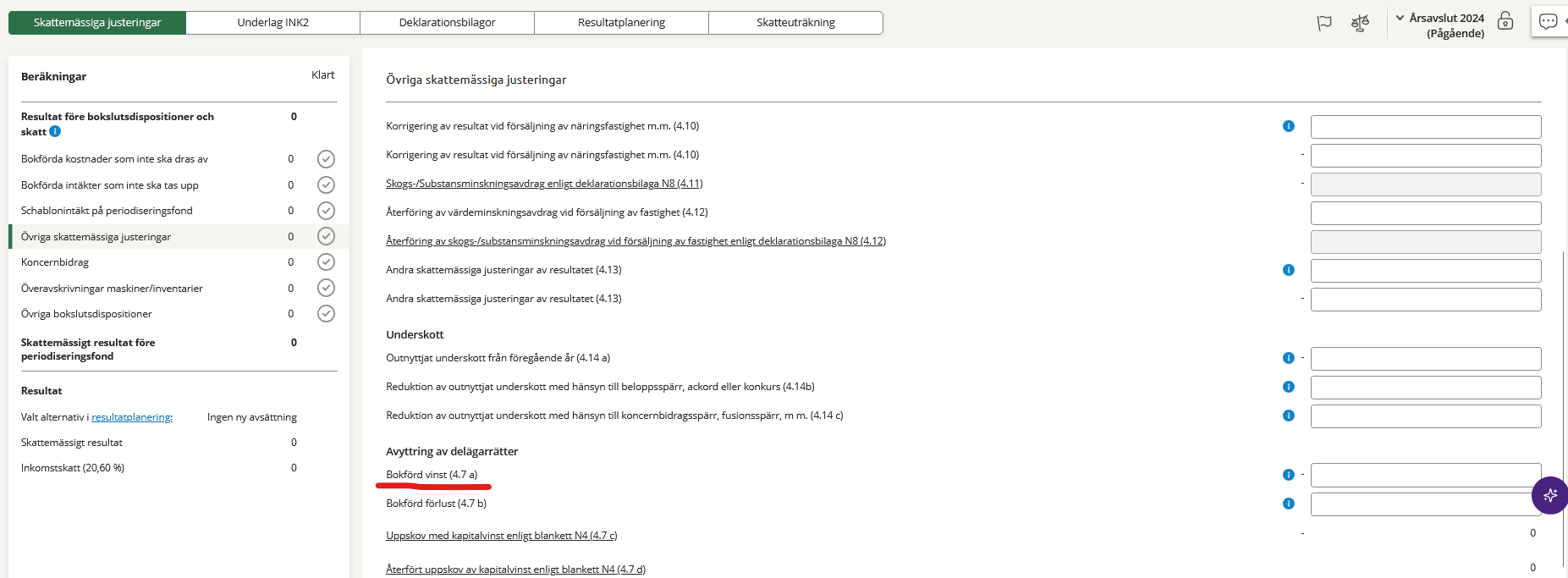 Detta får du lägga in manuellt under Skatteberäkning - Skattemässiga justeringar - Övriga skattemässiga justeringar.