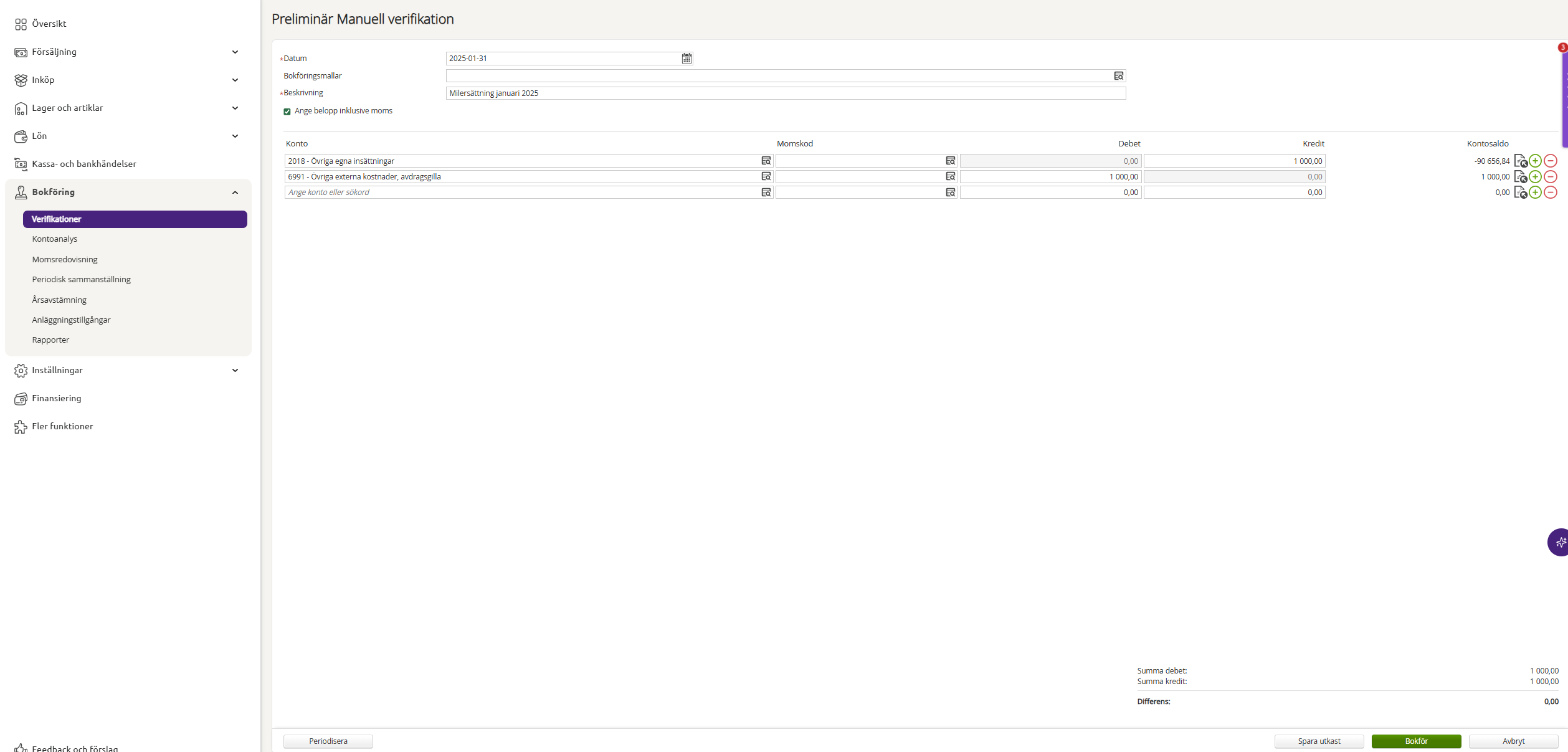 Min rekommendation är att du gör en sammanställning månadsvis och lägger in detta manuellt via Bokföring > Verifikationer på följande sätt.