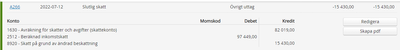 Jag fick en annan slutlig skatt dragen än den som var beräknad. Mikn beräknade inkomstskatt var 97449, men endast 82019 verkar ha dragits från skattekontot. När jag bokför enligt följande så balanserar inte min balansräkning med en diff på 15430.