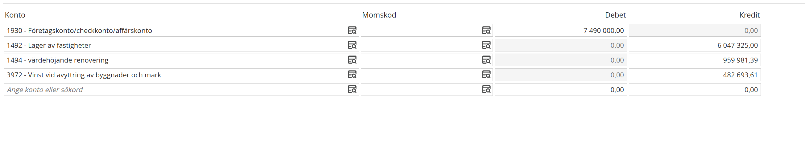 Hur bokför jag en försäljning av en lagerfastighet? Varulagret har alltså bestått av 1492 (lager av fastigheter) samt 1494 (värdehöjande renovering). Försäljningspriset överstiger värdet av dessa två poster.