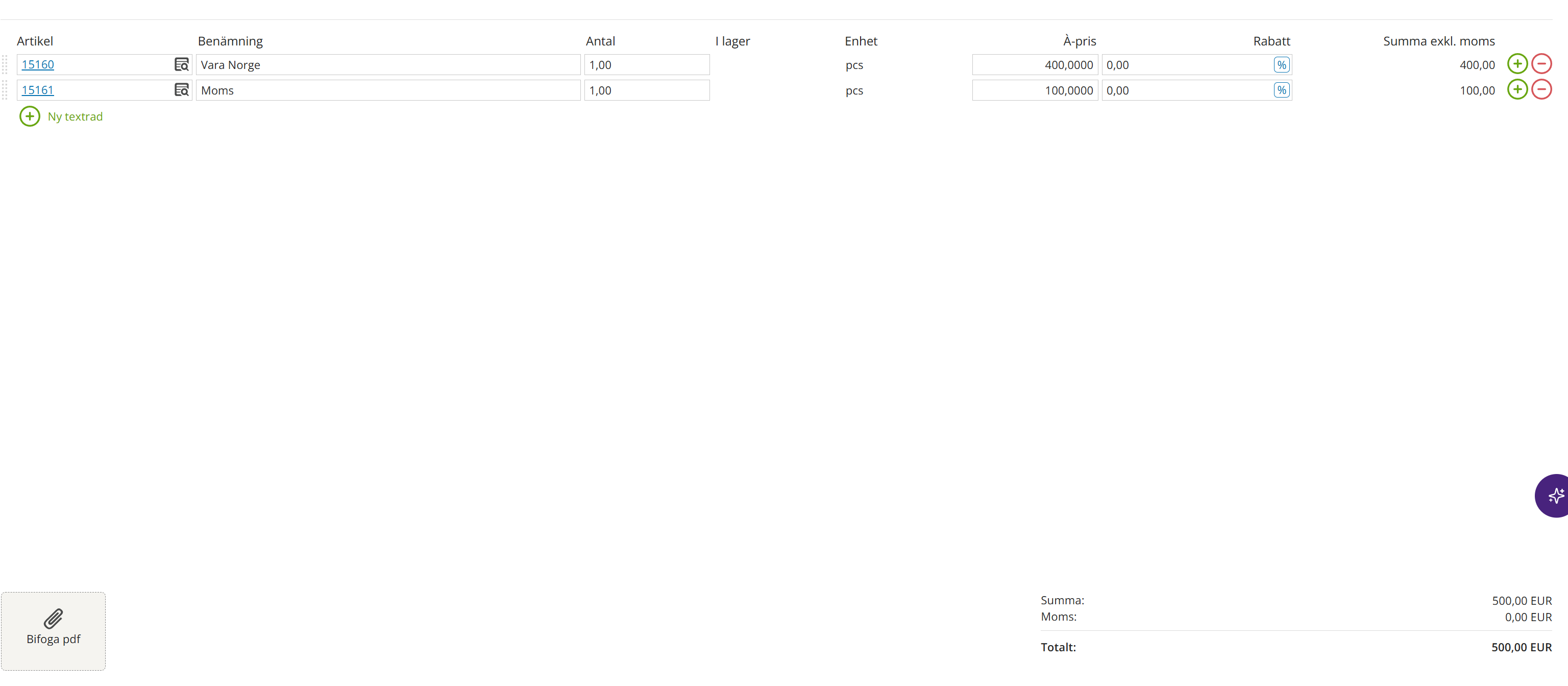 Du skapar en artikel för nettovärdet och en artikel för momsen och kopplar dessa mot rätt konto sedan lägger in båda dessa rader manuellt på fakturan.