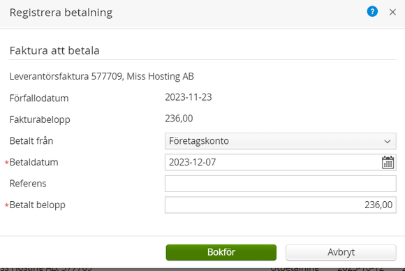Ett annat problem som också är värt att titta på, är om jag betalar fakturan i Leverantörsfakturor, istället för bankhändelser, så säger den 236 kr och kommer att godta detta belopp utan information. Den ger samma fel där som ovan.