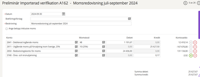 1. Tänkte redovisningskontot för moms på 199.363 kr stämmer ju inte för att det är dubbelt inlagt där efter jag bytte plats, exkl dec-dec-23, jag vet endast att summan borde vara 136.361 kr, det är vad jag har redovisat till skatteverket från dec-23 - dec-24?