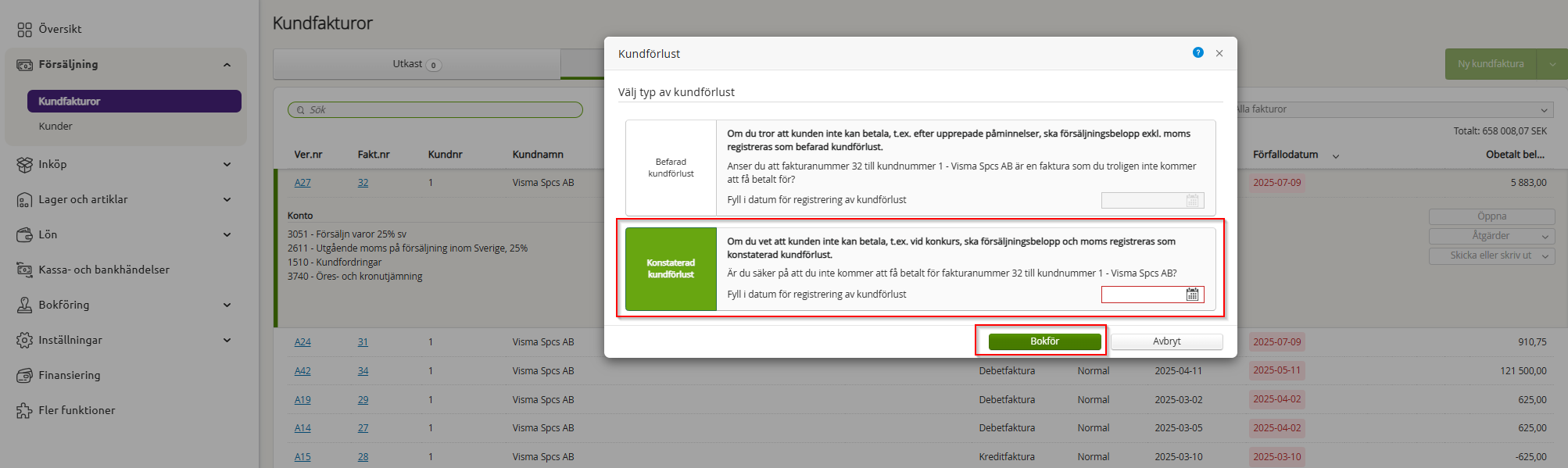 I nästa steg så väljer du kontaterad kundförlust. Ange datumet du vill att den skall bokföras på och tryck på bokför.