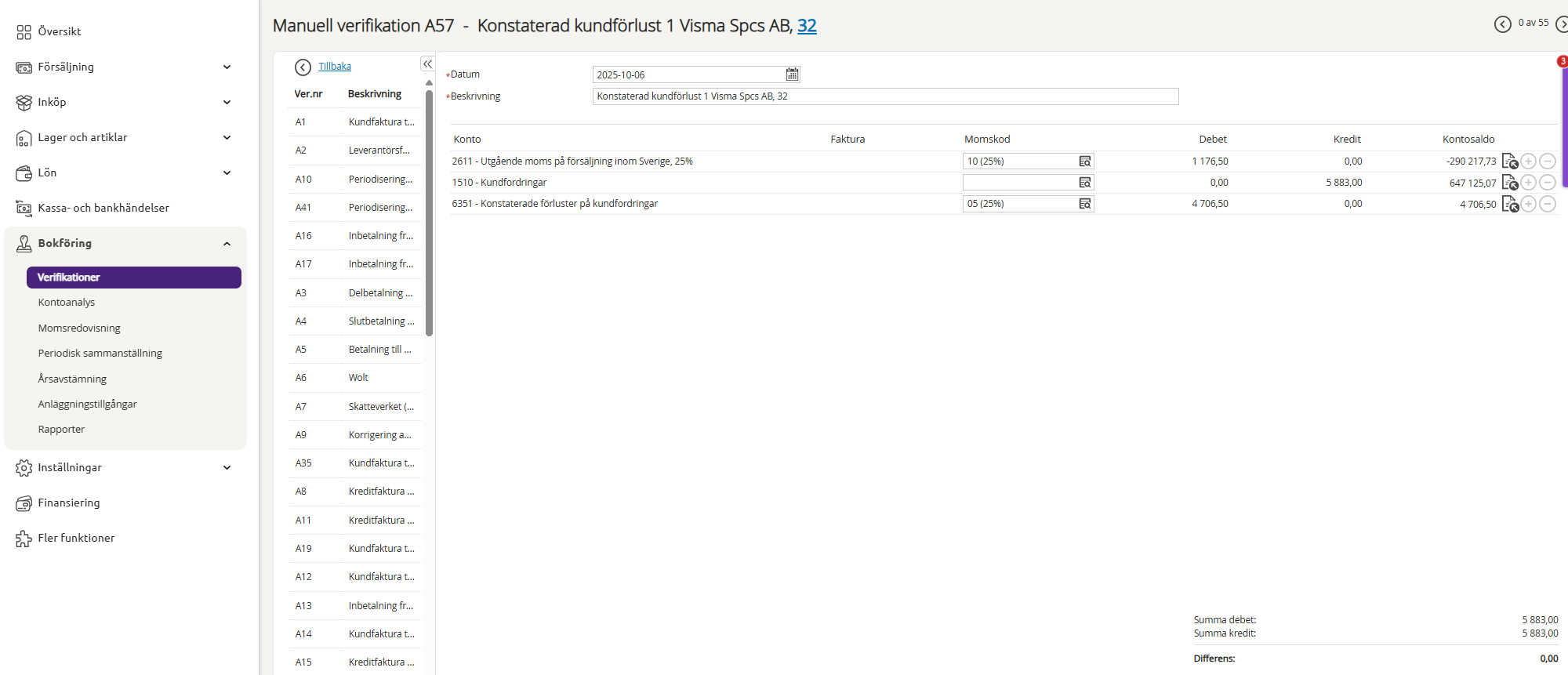 4- Därefter gör man manuellt en verifikation enligt nedan för att bokföra det som kundförlust.