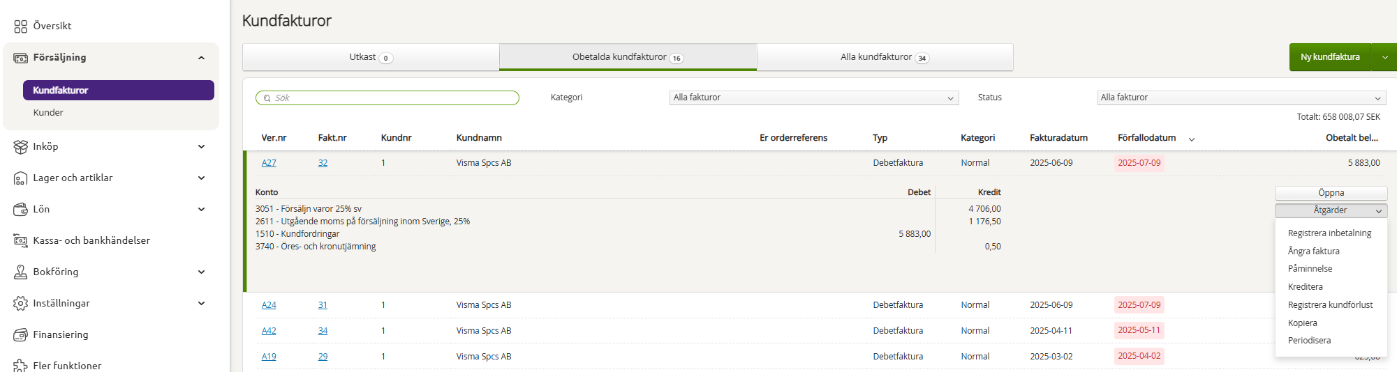 Gå istället in under Försäljning > Kundfakturor. Klicka på raden med kundfakturan som skall boköras bort som en konstaterad kundförlust och välj Registrera kundförlust.