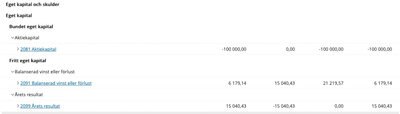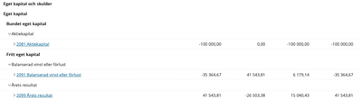 Så bra, här är en bild på eget kapital och skulder, från resultat 2025 ( jag har 2025 bokfört 2091 debet 15 040, 43, 2099 kredit 15 040, 43)