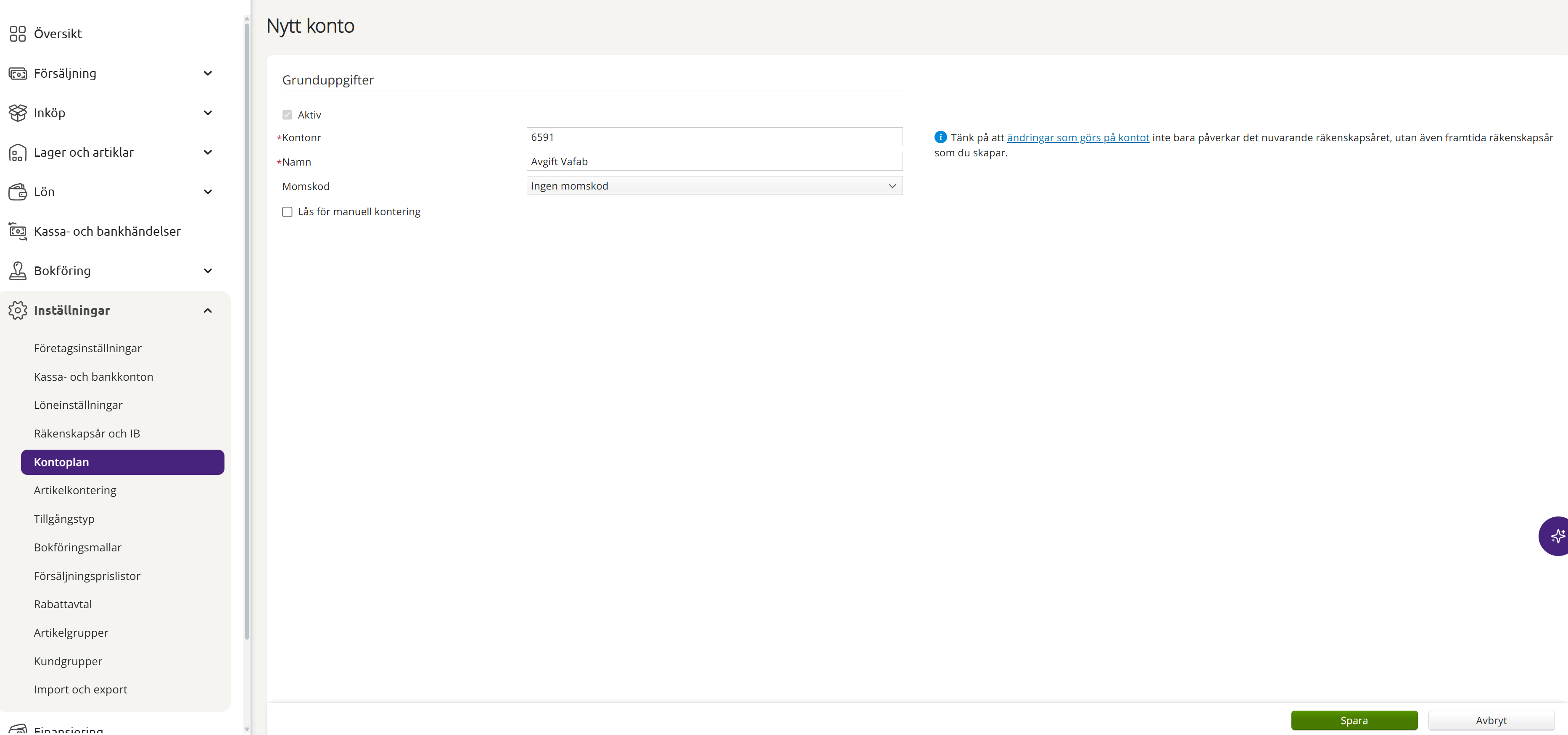 Tack för svar, kan jag skapa ett eget konto som jag döper till "Avgift Vafab"? Hur gör jag då? Tar man typ 6591 eller motsvarande?